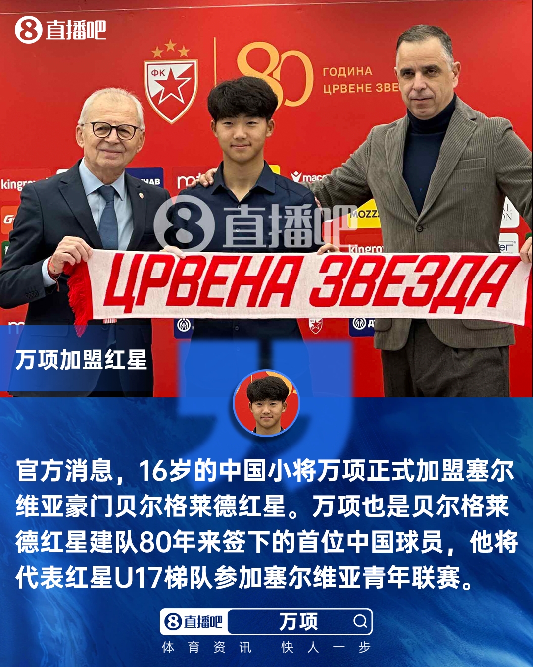 直播吧02月15日讯 中国U17国家队中场、湖北青训球员万项正式加盟塞尔维亚足坛豪门贝尔格莱德红星足球俱乐部,将代表俱乐部U17梯队参加塞尔维亚青年联赛。