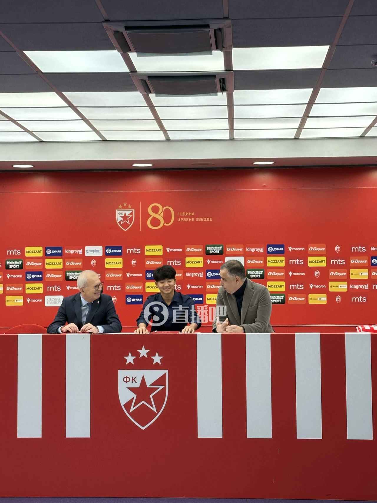 中国球员万项(中)、贝尔格莱德红星俱乐部主席米亚伊洛维奇(左)和青训主管耶利奇出席签约仪式