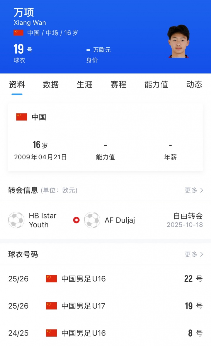 万项2009年出生于黑龙江七台河,成长于湖北青训。司职中场,是中国U17国家队主力球员。2025年11月,在U17亚洲杯预选赛中,万项代表国少队出战5场,贡献5粒进球、6次助攻,攻防表现稳定,是球队晋级决赛阶段的重要球员。