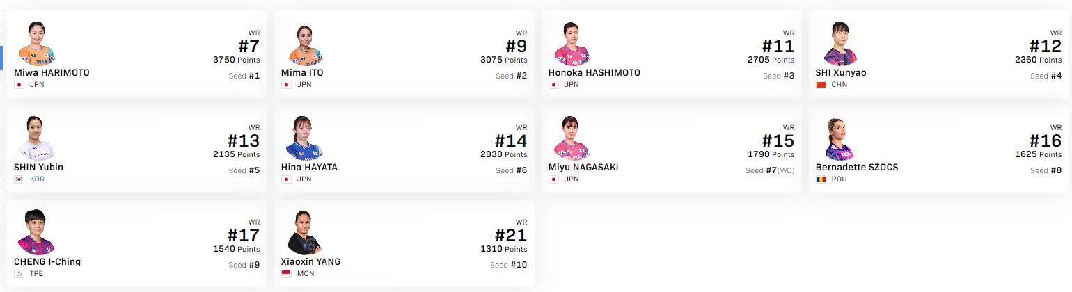 女单前十种子球员分别是:张本美和(头号种子)、伊藤美诚(2号种子)、桥本帆乃香(3号种子)、石洵瑶(4号种子)、申裕斌(5号种子)、早田希娜(6号种子)、长崎美柚(7号种子)、斯佐科斯(8号种子)、郑怡静(9号种子)、杨晓欣(10号种子)。