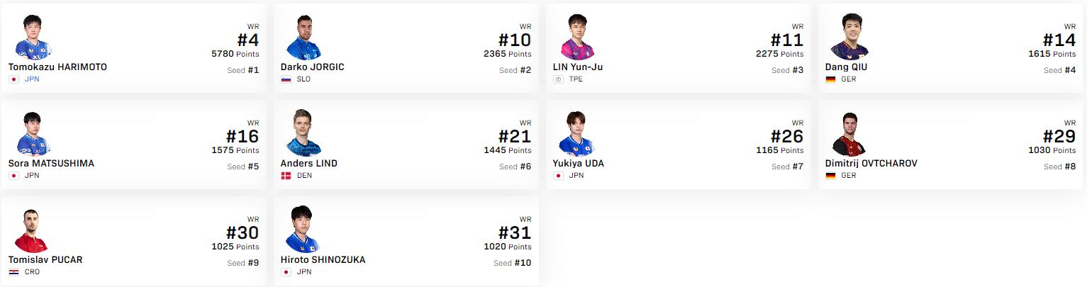 男单前十种子球员分别是:张本智和(头号种子)、达科(2号种子)、林昀儒(3号种子)、邱党(4号种子)、松岛辉空(5号种子)、林德(6号种子)、宇田幸矢(7号种子)、奥恰洛夫(8号种子)、普卡(9号种子)、筱塚大登(10号种子)。