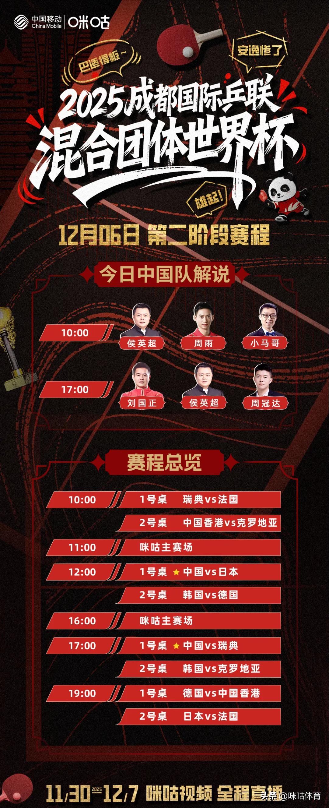 12月6日,国乒再次迎来双赛,来咪咕看比赛,为中国队加油!