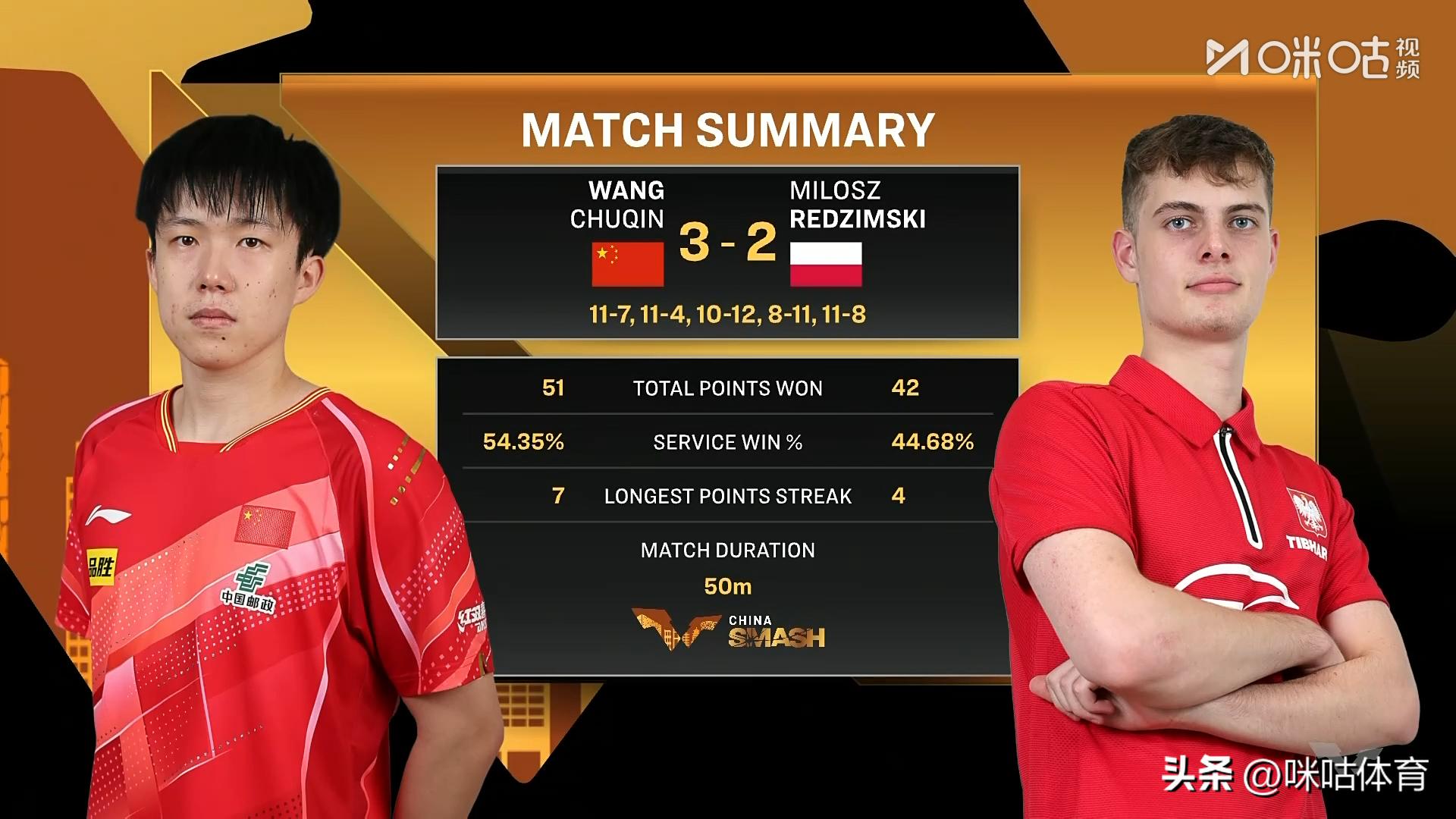比赛一开始,王楚钦面对波兰小将没有过多试探,开局进入状态很早,不过雷德齐姆斯基卸下包袱,多次主动尝试发起进攻,双方战至7比7;随后王楚钦不再啰嗦,接连小球抓对手空挡,一波带走以11比7拿下首局。