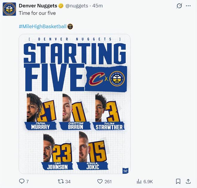 掘金:穆雷、布劳恩、斯特劳瑟、约翰逊、约基奇;
