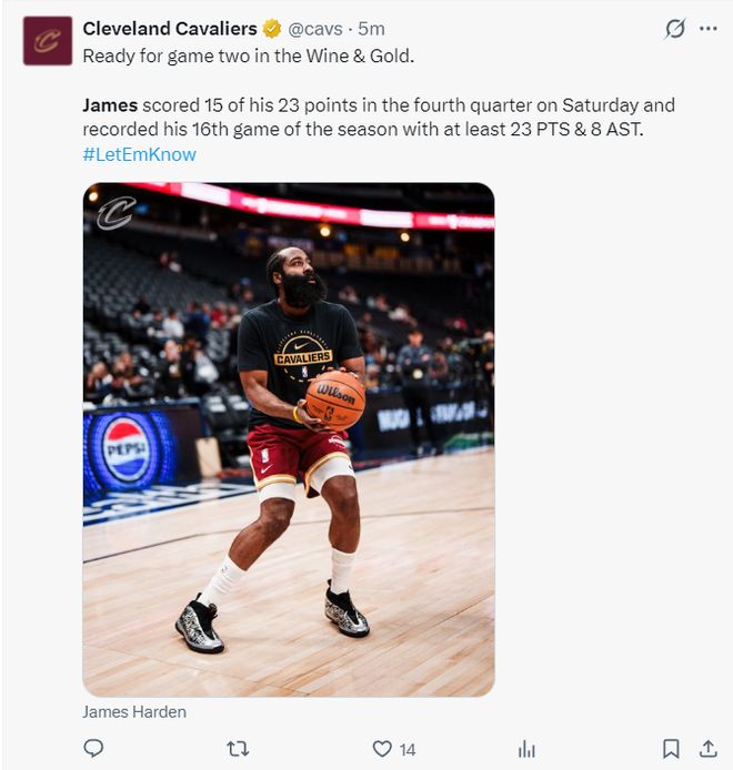 北京时间2月10日,NBA常规赛,骑士客场以119-117击败掘金拿到四连胜,这是哈登骑士生涯的第二场比赛,开场骑士就陷入苦战落后,掘金一度领先到11分,末节哈登命中绝平三分,哈达威反绝杀不中,米切尔造犯规两罚准绝杀,约基奇压哨不中比赛完结。