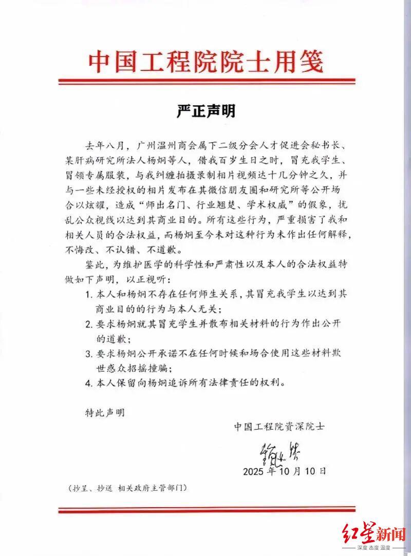 声明提到,2024年8月24日,杨炯等五人在得知钟世镇院士的弟子将为钟院士举办百岁庆典之际,就千方百计地想参与,先是通过钟院士身边的几位工作人员求带入场,在遭到严正拒绝后又采取哄骗手段冒领了五套庆典服装和纪念品等,随后大摇大摆神气活现地和钟院士纠缠拍制视频和照片达十几分钟之久,甚至妨碍并阻挠钟院士的弟子和邀请的来宾与钟院士的合影,引发钟院士学生群弟子们的一片不满和谴责。