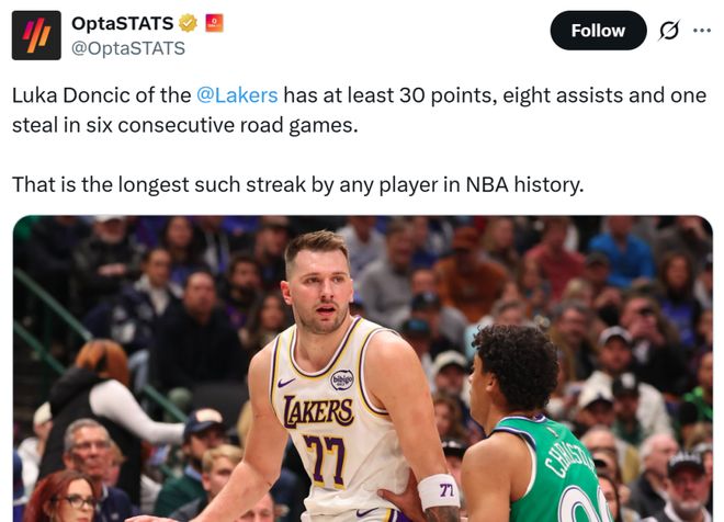 不愧是湖人新核!东契奇狂轰33+8+11大号准三双力擒旧主,又一次创造历史最长纪录,中场乌龙一幕更是让人泪目。