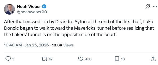 在比赛中场结束时,独行侠队记Noah Weber曝出东契奇直接朝着独行侠的球员通道走去,突然意识到不对后,又转身朝着位于球场的另一侧的湖人球员通道走去。