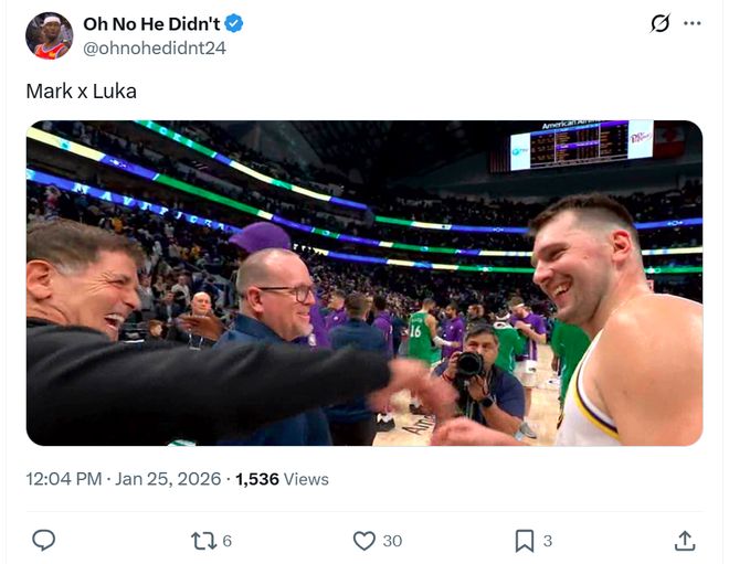 值得一提的是,赛后东契奇不忘与独行侠前老板库班寒暄,两人开怀大笑。