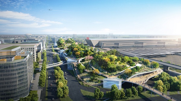 虹场绿丘(西交通平台),作为西交通平台的核心设计,规划将改造已建成区域,植入虹桥全球服务中心、新质生产力展示馆等功能,缝合交通枢纽与核心区空间。其中,最受关注的“巨型屋顶公园”将模拟自然山势,构建两座的“小山脉”,高度约39米。华建集团华东建筑设计研究院有限公司首席总建筑师杨明介绍,设计融入《千里江山图》青绿山水意境,以层叠建筑搭配空中步道连接周边街区,打造“空中青丘”视觉焦点;同时优化虹桥火车站“虹桥光谷”空间与长途客运站布局,实现平台上下功能联动。