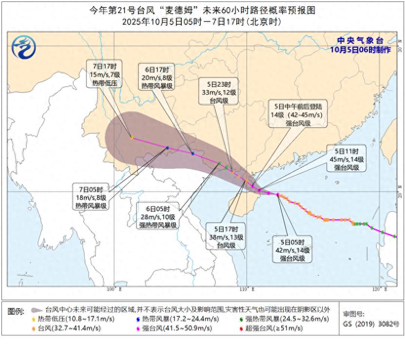 预计,“麦德姆”将以每小时20~25公里的速度向西偏北方向移动,强度还将有所加强,并将于今天(5日)中午前后在广东吴川至海南文昌一带沿海登陆(强台风级,14级,42~45米/秒),登陆后强度逐渐减弱。