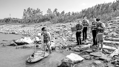 团队成员在长江岸边采集数据。苑煊摄/光明图片