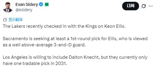 北京时间1月7日,据名记Sidery报道,湖人队最近就基翁-埃利斯一事与国王队进行了谈判。国王希望用埃利斯换来至少一个首轮签,埃利斯被认为是一名远高于平均水平的3D后卫。湖人愿意将克内希特加入交易,但他们目前只有2031年一个可交易的首轮签。