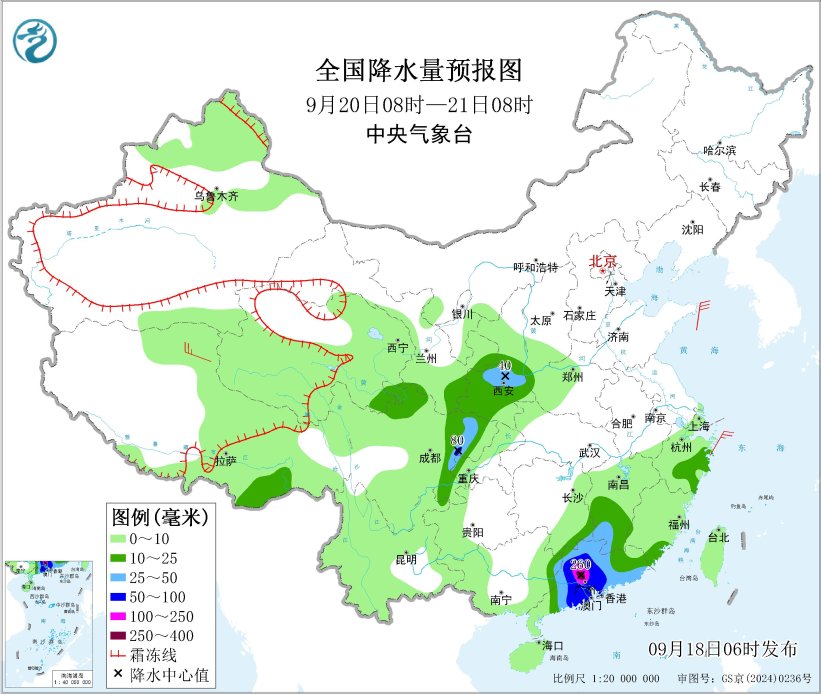 9月20日08时至21日08时,陕西中部、江西南部、四川盆地东北部、华南中北部和南部等地部分地区有大到暴雨,其中,广东中部等地部分地区有大暴雨,局地特大暴雨(250~260毫米)。黄海北部海域将有6~7级风、阵风8级,南海西南部海域将有5~6级风、阵风7级。