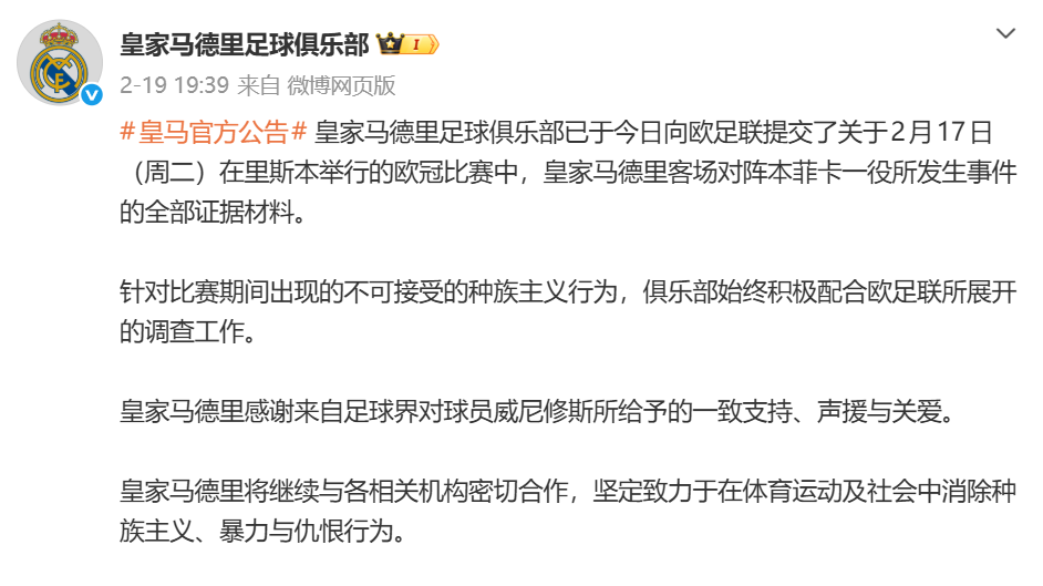 很快在2月19日,皇马正式发布官方公告,表示俱乐部已向欧足联提交了全部证据材料。
