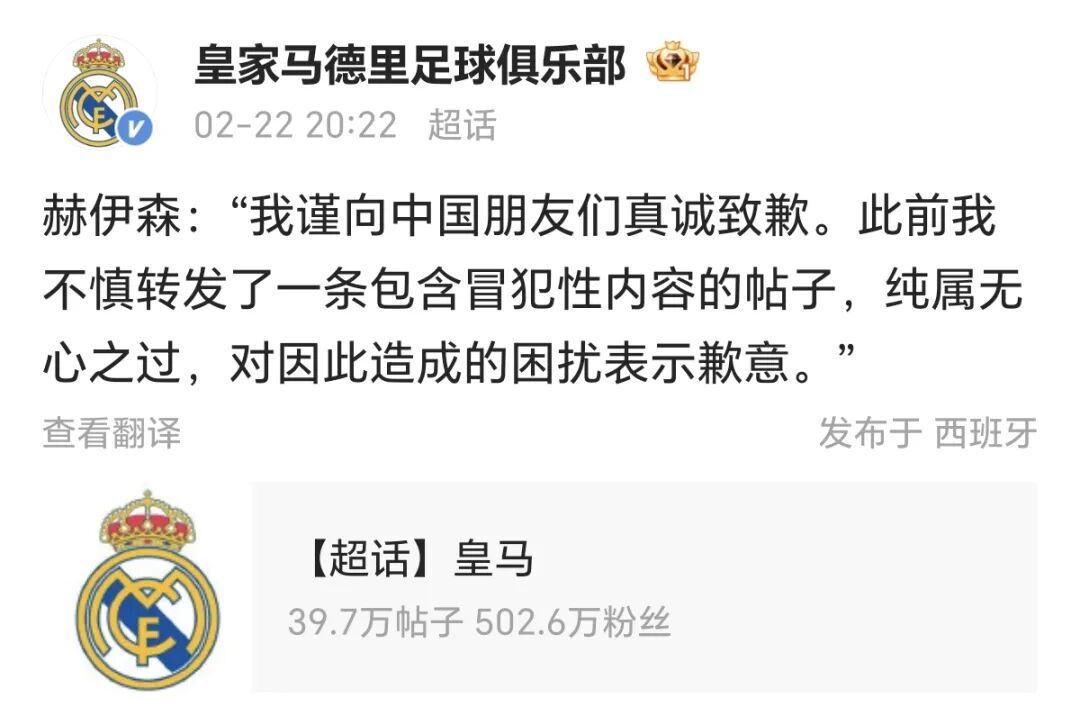 2月22日,皇马官方微博超话发布一则消息,疑似为赫伊森进行道歉。但是,皇马官网和赫伊森个人社媒并无相关内容。