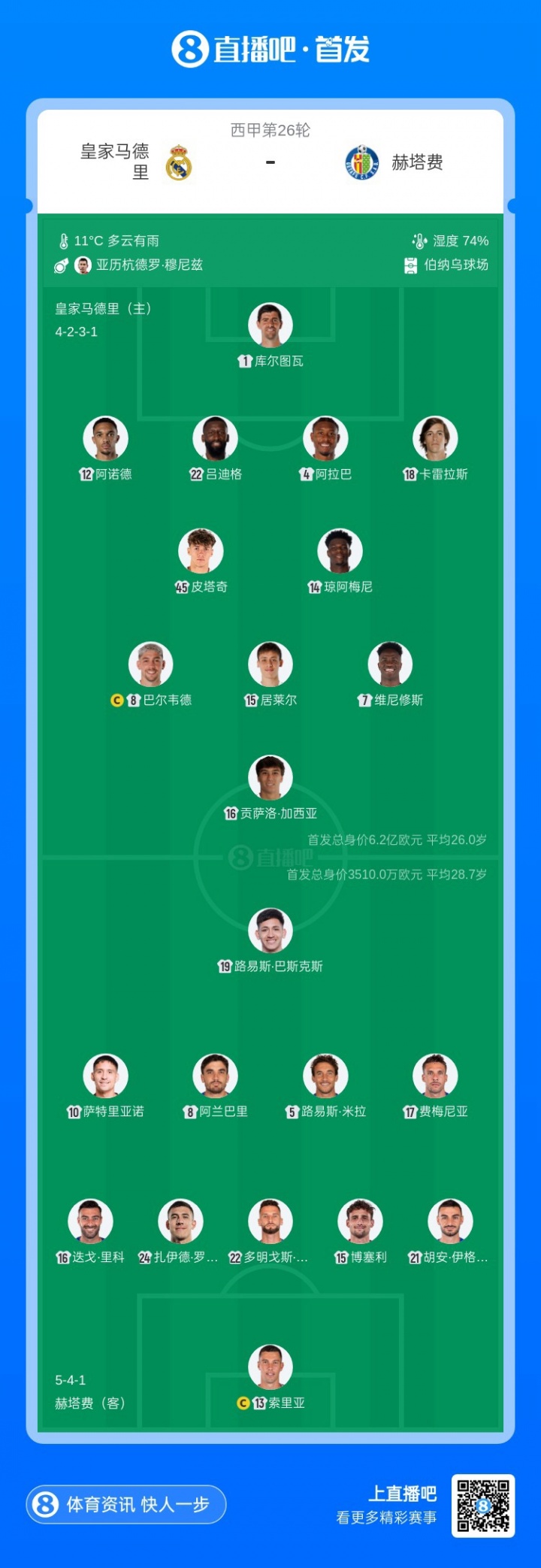 直播吧3月3日讯 西甲第26轮,皇马对阵赫塔费,赛前首发公布。姆巴佩伤缺,维尼修斯、阿诺德、皮塔奇、贡萨洛·加西亚先发。