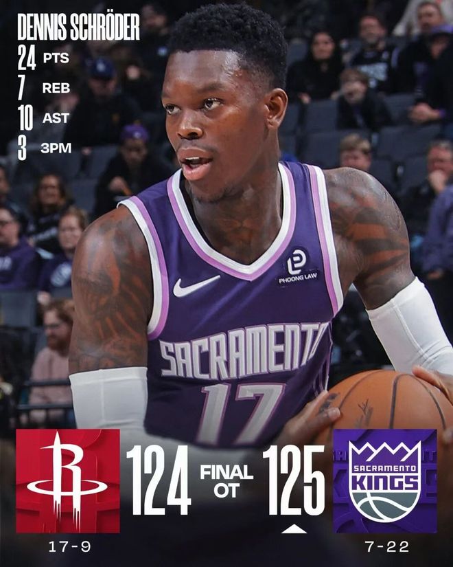 一场本该毫无悬念的比赛,因为萨克拉门托国王队的不肯认命,因为丹尼斯·施罗德的致命三分,变成了休斯顿火箭队本赛季最尴尬的失利之一。国王队在主场通过加时赛以125-124险胜火箭,终结了对手的三连胜。
