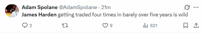 火箭记者Adam Spolane回应:詹姆斯-哈登这个级别的球星在过去的五年里即将被交易第四次,这实在是太疯狂了。