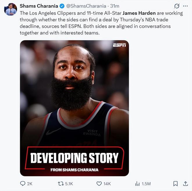 赛季至今哈登出战44场比赛,场均35.4分钟,拿到25.4分4.8篮板8.1助攻1.3抢断,命中率41.9%,哈登托底能力有目共睹,根据Shams所说哈登也有意在交易截止日离开快船,现在是快船、哈登双方都在努力将他送到一支更具竞争力的球队。