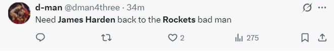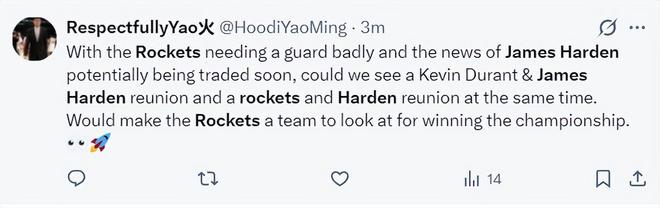 哈登可能重返休斯顿的消息出炉后,火箭球迷们纷纷发声:火箭急需一名控球后卫,哈登即将被交易的消息传出,我们有机会看到杜兰特、哈登第三次携手,如果这两人在休斯顿重聚,我们有希望拿到总冠军。