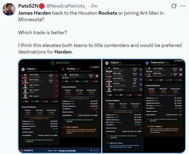 美媒PSAN模拟了一套火箭交易得到哈登的方案,那就是火箭送出范弗利特、亚当斯、2028年首轮签、2026年黄蜂次轮、2027年灰熊次轮得到哈登,也就是5换的1方案。哈登本赛季薪水3918万,范乔丹+海王刚好配平。