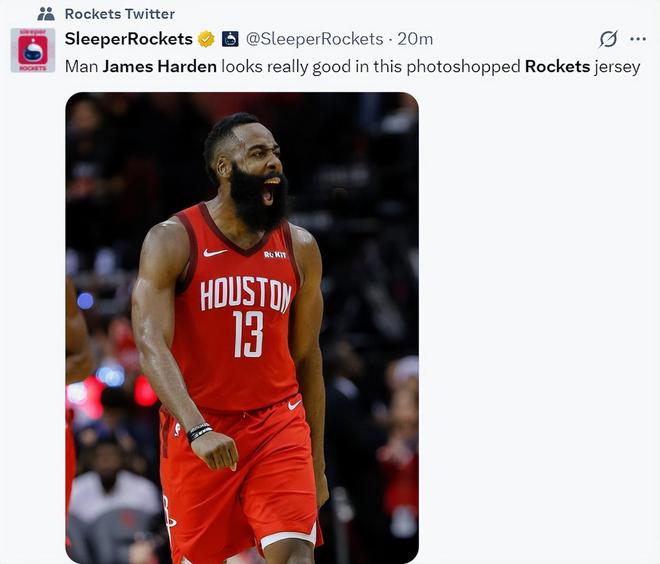 休媒SR写道:这张哈登“PS”的火箭球衣照片看起来他的状态非常之好。
