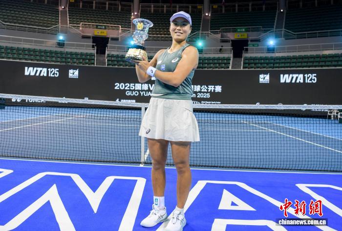 10月18日,2025国缘V3济南国际网球公开赛女子单打决赛在山东济南举行,印度尼西亚选手曾丽美以6-4、4-6、6-4的成绩战胜匈牙利选手邦达尔,夺得女子单打冠军。图为印度尼西亚选手曾丽美手捧冠军奖杯庆祝。 中新社记者 张勇 摄