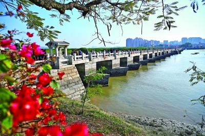福建泉州,远处的城市风景与千年古桥洛阳桥交相辉映。新华社发