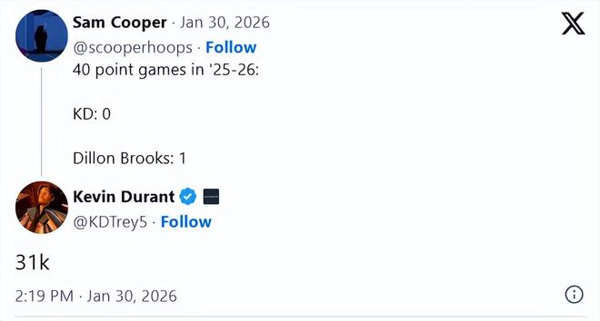 作为交易杜兰特的筹码之一,狄龙本赛季的表现非常出色,近日单场轰下40分,创生涯新高。有球迷指出,效力太阳队期间,狄龙的40+得分场次是1场,比杜兰特(0场)还多,杜兰特则回复道:“31K”,显然是以自己生涯累计31736分的成就予以回应。