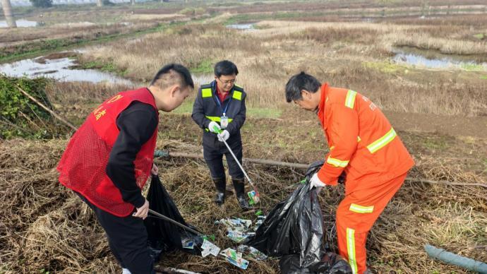 活动当天上午9时,将军路市政环卫工作人员准时集结,迅速投入战斗。在整治现场,他们充分发挥专业优势,展现出高效有序的作业能力:面对沿岸草丛中的白色垃圾,工作人员弯腰俯身,用夹子精准夹取(见下图),避免垃圾碎裂污染土壤;遇到缠绕在植被间的塑料袋、包装纸等,他们耐心拆解清理,不放过任何细小杂物;针对体积大、重量沉的废弃家具、建材等大件杂物,多人协作搬运,将其稳妥送至临时清运点,再由环卫清运车及时转运处理。