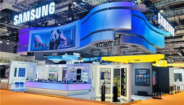 在展台设计与搭建过程中,三星积极响应进博会“绿色办展”号召:采用 LED 与新能源照明降低能耗,优先使用可再生回收材料,主体结构应用免喷涂环保饰面,并严格选用低 VOC 材料,最大限度减少环境污染。