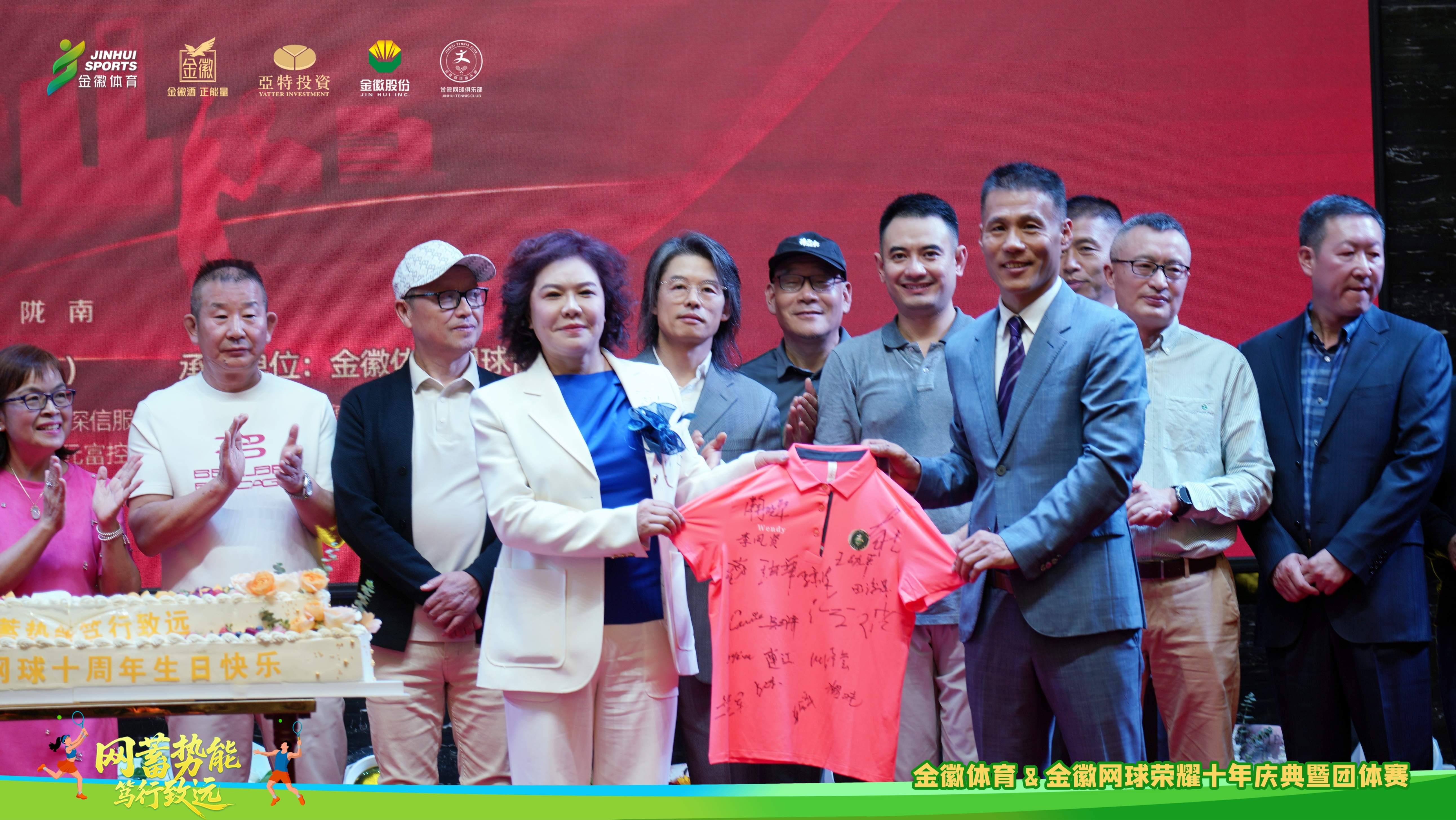 晚宴灯光渐暗,一场温馨的 “惊喜环节” 悄然开启 —— 全球 25 家俱乐部的会长共同捧着一件特殊的金徽网球专属球服,缓缓走向杜楠主席。这件球服上签满了所有会长的名字,每一笔字迹都藏着 “双向奔赴” 的情谊,既是对杜楠主席十年引领的感谢,也是 25 家俱乐部 “同心同行” 的见证。据悉,这件意义非凡的战袍后续将入驻 “金徽体育文化博物馆”,成为金徽网球十年发展的珍贵印记,也将这份跨越地域、联结你我的情谊永久留存。
