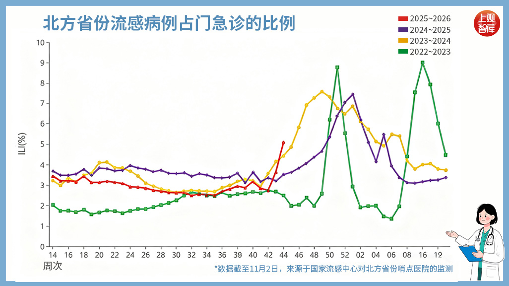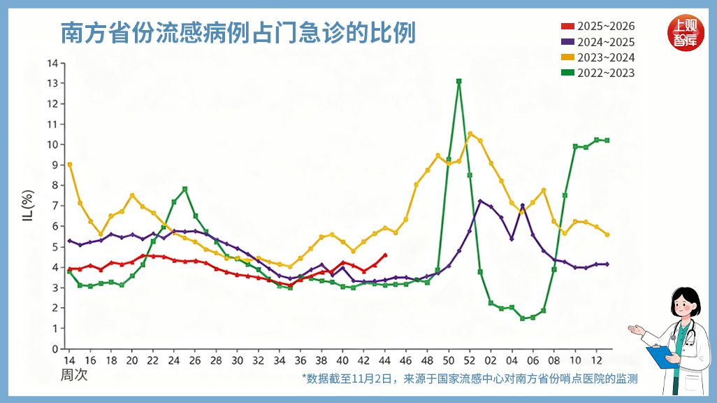 但从包括上海在内的南方省份来看,今年流感活动虽然较2024年和2022年有所上升,但在门急诊中所占比例尚不及2023年。