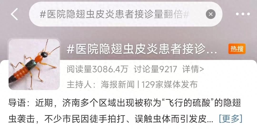 近日“医院隐翅虫皮炎患者接诊量翻倍”的话题