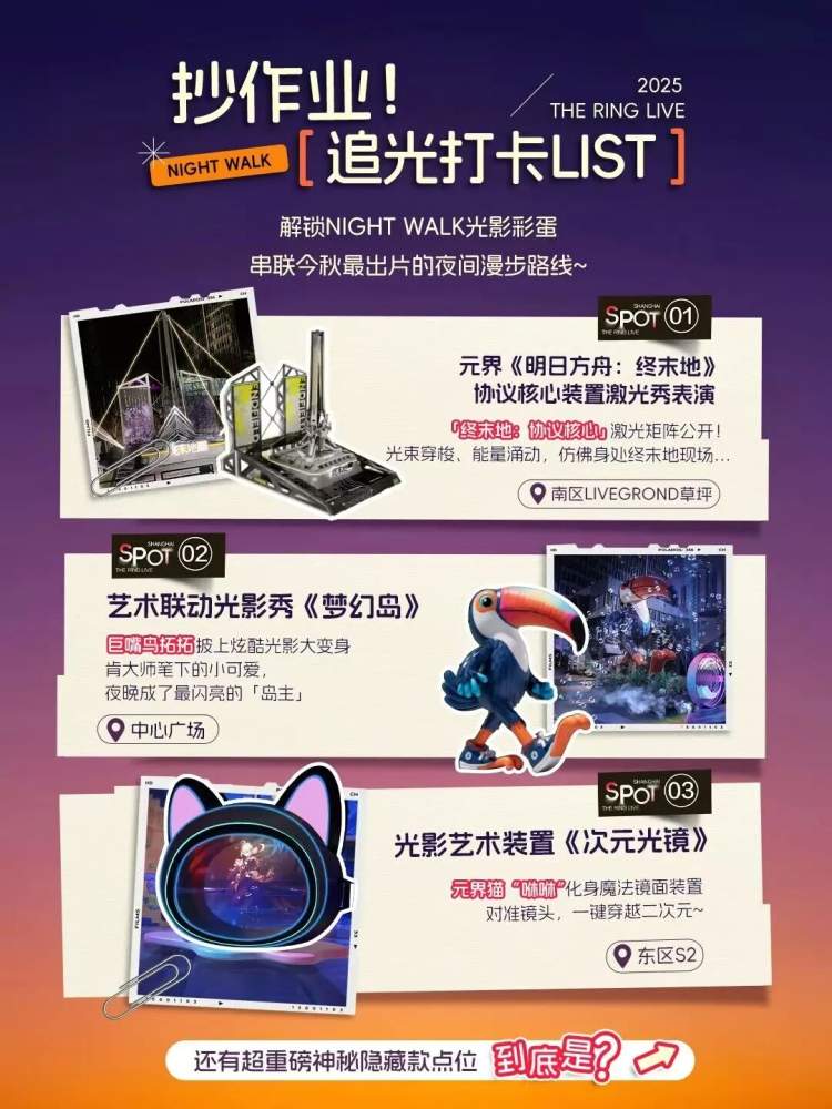 本次分会场还实现了文化、商业、旅游、体育、展览多领域的深度跨界联动,众多热门品牌和主题活动以“+光影”的形式链接全区资源,突破商圈间隔,覆盖吃喝玩乐购全场景。在西岸梦中心,市民可加入五星体育・首届上海运动节体验夜跑的快乐,也能参与福利多多的西岸梦中心一周年庆典;元宇宙街区更是热闹非凡,超多大型二次元光影联动快闪齐聚于此,与“元界秋日奇遇季”活动相映成趣,共筑虚实交融的沉浸盛宴;而在徐家汇商圈与衡复风貌区则汇聚了众多光影联名商圈消费活动,点亮城市夜经济,将为市民游客带来别具一格的秋日浪漫体验。