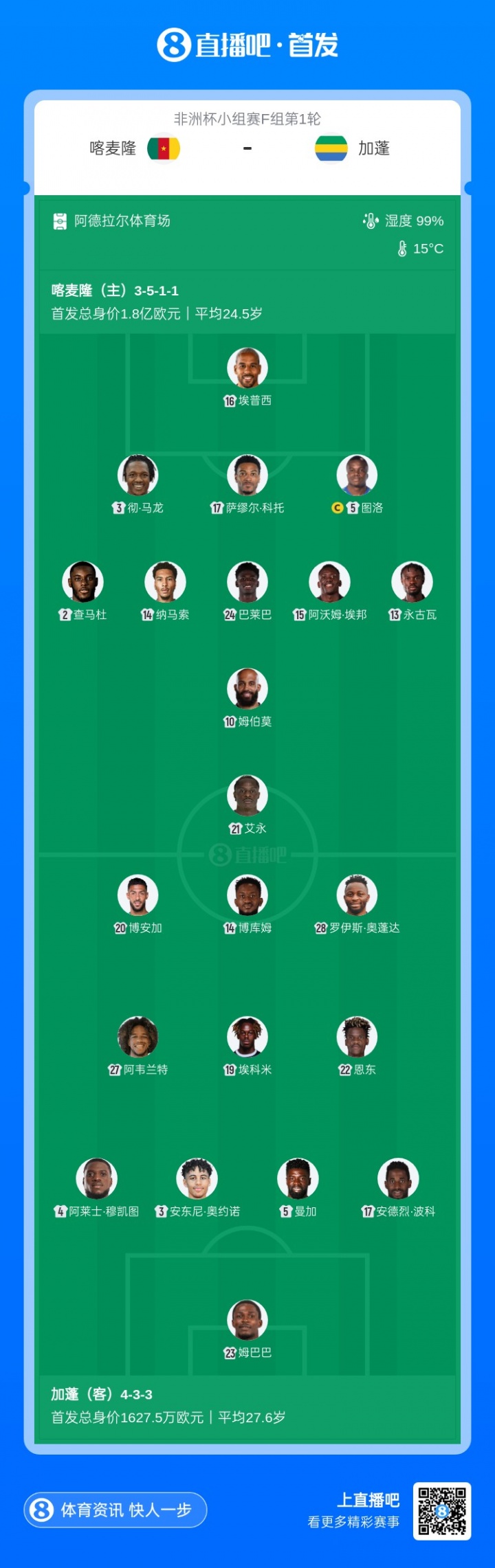 直播吧12月25日讯 北京时间12月25日4:00,非洲杯小组赛F组第1轮,喀麦隆vs加蓬。赛前双方公布了本场比赛的首发名单。