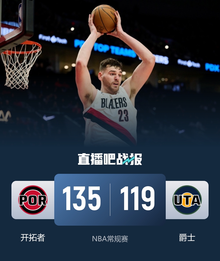 开拓者(27-29):霍勒迪31分9板7助、克林根23分18板7助3帽、格兰特18分3板2帽、亨德森15分1板4助、卡马拉14分8板3助2断、克雷伊奇11分5板2助、乐福11分2助、西索科8分4板1助2断、吕佩尔2分4板、杨瀚森2分