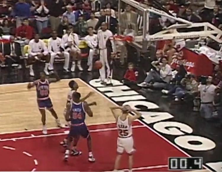 在1994年12月25日的芝加哥,比赛还剩3.3秒时,公牛队以100-97领先。安东尼·梅森从后场发出长传,球直接飞向站在篮筐右侧的史蒂夫·科尔。科尔跳起接住了球,但他担心自己会摔倒并被判走步违例,所以他试着把球传给队友。