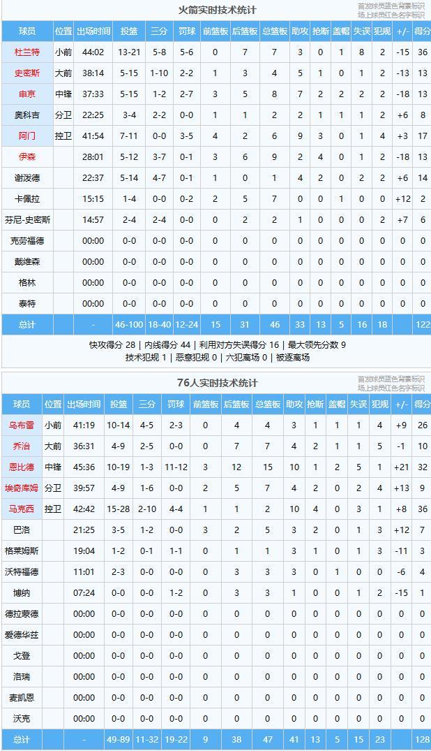 杜兰特36分7板3助、阿门17分6板9助3断、谢泼德14分1板4助2断、伊森13分9板2助4断、申京13分8板7助2断2帽、史密斯13分4板5助、奥科吉8分2板2助、芬尼-史密斯6分2板1助