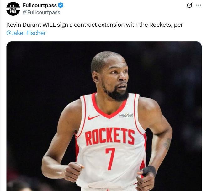 可签2年1.22亿美元肥约,杜兰特被曝将提前与火箭队续约!同时遭遇十字韧带撕裂大伤的范乔丹成功接受手术,火箭队4人杀入现役前百球星行列,新赛季继续冲击冠军。