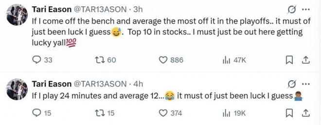 伊森本人也在社媒连续发文:“如果说我场均24分钟可以拿到12分是运气,那么我季后赛作为替补场均得分最高,在抢断和盖帽方面排名前十,可能也都是运气好吧!”