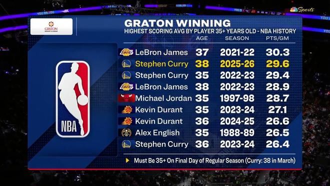 此役,库里还创下了神迹。比赛途中,转播方晒出了NBA历史上,至少35岁(常规赛最后一个比赛日必须达到35岁)单赛季场均得分榜前9,库里三次排进前9。
