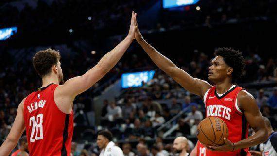根据ESPN的数据,这对年轻的二人组(分别为22岁和23岁)本赛季共同出场的时间是火箭队所有组合中最多的。他们也已经建立起了一种日益增长的化学反应,有望在未来多年席卷联盟。汤普森和申京本赛季场均合砍40.8分,而上赛季(2024-25赛季)是33.2分。当汤普森和申京同时在场时,火箭队场均净胜对手6.0分,比上赛季提高了2.2分。