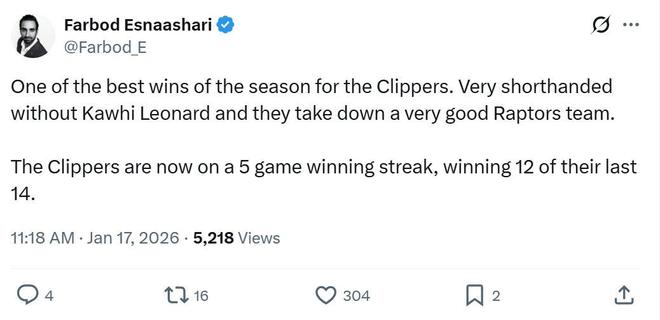 正如赛后快船记者Farbod Esnaashari所说:“这是本赛季快船最精彩的胜利之一,他们在缺少小卡的情况下,逆转击败强敌猛龙。”