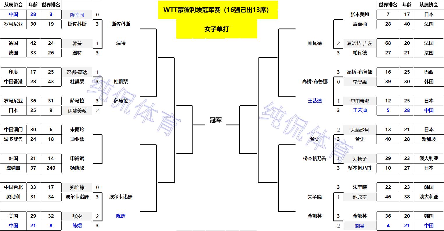 北京时间10月30日凌晨,乒乓球WTT蒙彼利埃冠军赛结束了第2个日的争夺,男、女单16强各诞生了13席,本人整理了详细签表,如下图所示。本站赛事可谓是冷门不断,男、女单前十种子球员中,目前已有8位种子遭遇一轮游,出乎了球迷的预料,下面带来详细信息。