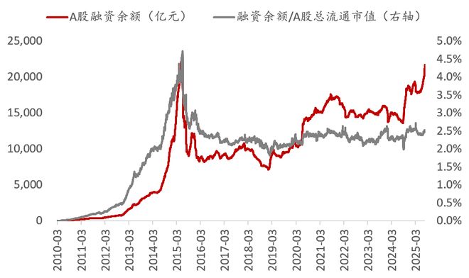 有人担忧A股的融资规模已经超过2015年的最高点了,市场出现过热风险。但事实上,融资余额占流通市值比例(2.49%)远低于2015年峰值(4.7%),显示杠杆风险可控。