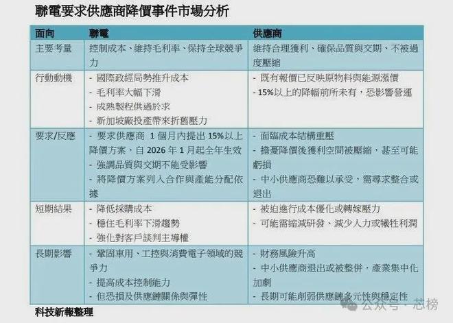 联电要求供应商 2026 年降价 15% 以上,正是通过成本优化与技术升级,力求在竞争中维持生存空间。