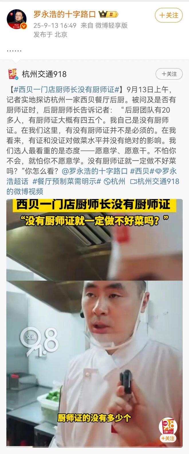 他转发包括“西贝厨师长回应菜品用浓缩鸡汤”“西贝一门店厨师长没有厨师证”等媒体报道。