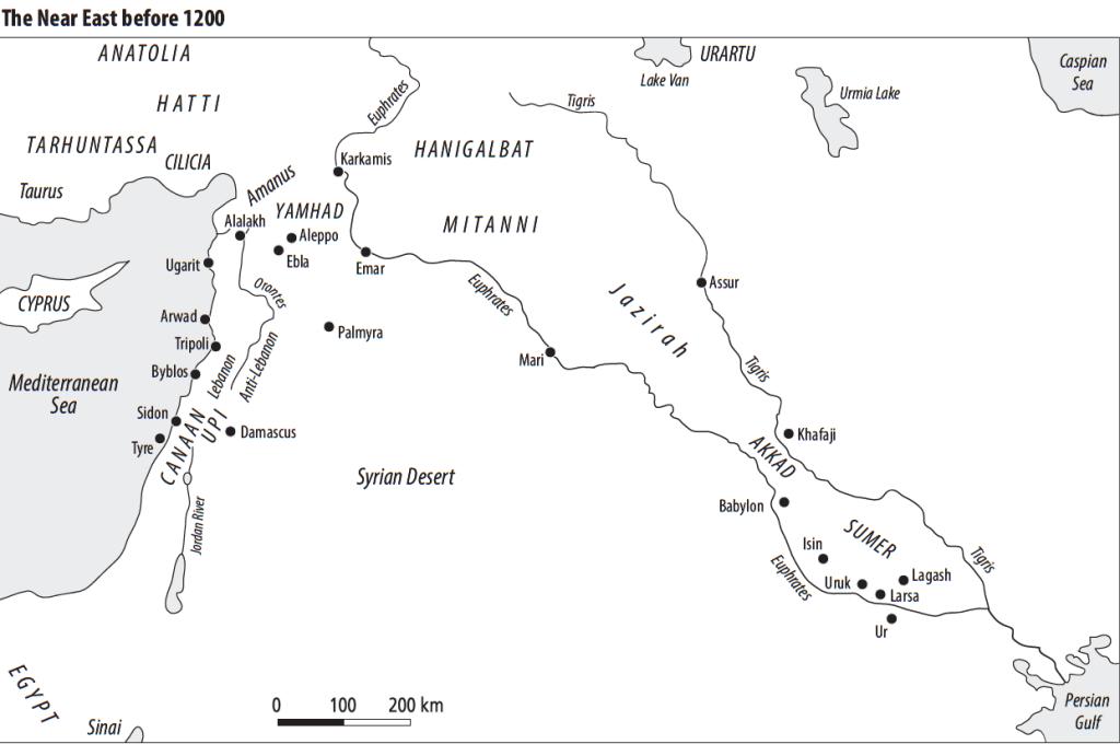 公元前1200年近东地图,显示出古代腓尼基人。迦南(Canaan)北面是叙利亚古城阿勒颇(Aleppo),东面是著名的幼发拉底河(Euphrates)和底格里斯河(Tigris),这两条河相距很近,在下游合流进入波斯湾。古代苏美尔(Sumer)文明集中在这两条河下游区域。来源:The History of Phoenicia, by Josette Elayi, translated from the French by Andrew Plummer, Lockwood Press, 2018, 292